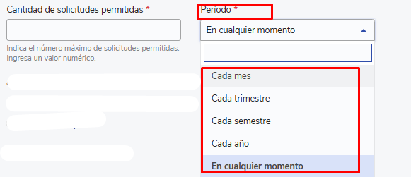 En la opción Cantidad de solicitudes permitidas debes indicar el número máximo de solicitudes y en "Periodo", encontrarás 5 rangos de periodicidad para establecer límites.