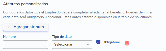 Los atributos son la forma en la que puedes solicitar información adicional al colaborador que está solicitando un beneficio, también podrás configurar si el dato solicitado es de tipo Obligatorio.