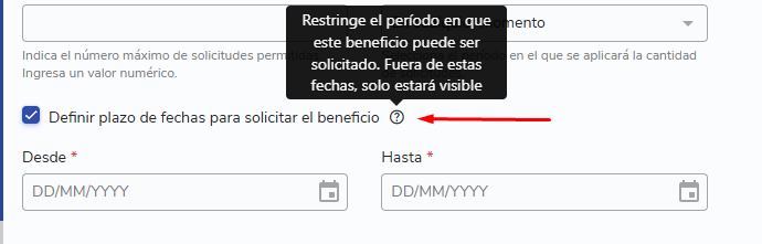 Puedes indicar un rango de fechas en las cuales el beneficio podrá ser solicitado en la opción Definir plazo de fechas para solicitar el beneficio: