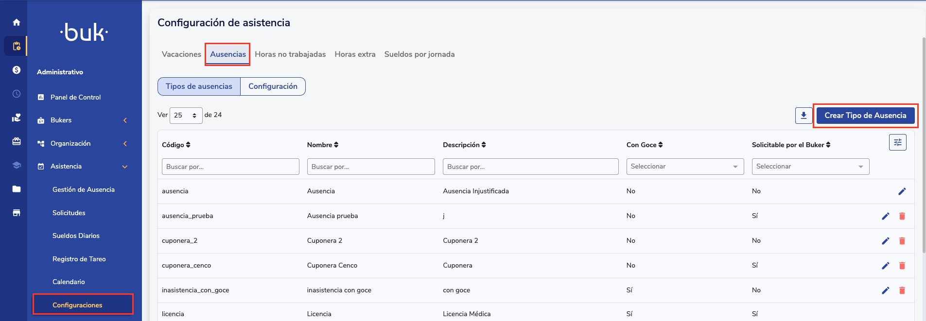 Para implementar beneficios integrados con permisos, primero verifica la configuración de tus permisos en Administrativo > Asistencia > Configuraciones > Ausencias