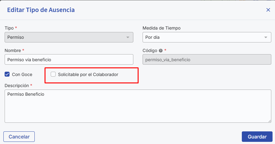 Para que un nuevo Tipo de Ausencia solo aparezca en la configuración de "Integración con permiso desde Beneficios" y no en la pestaña "Asistencia" de la ficha del colaborador, no debes seleccionar la opción "Solicitable por el colaborador". Al desactivar esta opción, el nuevo permiso solo estará disponible al crear un beneficio integrado con permiso y no en la sección de Asistencia para el colaborador.