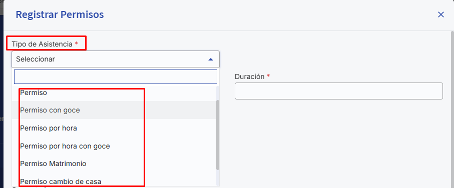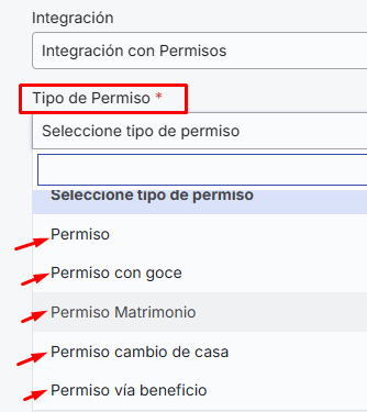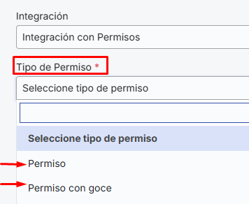 Posteriormente, deberás seleccionar el “Tipo de permiso”, se desplegarán las opciones previamente establecidas en la sección “Tipos de Ausencia”. Recordar que el plan esencial únicamente exhibirá dos opciones: “Permiso” que es la opción sin goce de sueldo y “Permiso con goce”. Los clientes que han contratado el plan pro, tendrán la facultad de visualizar y seleccionar los demás tipos de ausencia creados en el punto anterior: