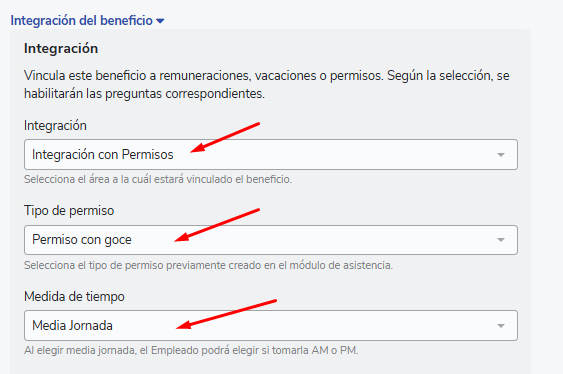 La configuración y creación de un beneficio integrado con permisos, es igual al flujo habitual