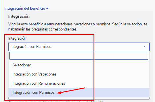 Cómo crear un beneficio. Al llegar a la opción “Integración” encontrarás 3 opciones, deberás seleccionar “Integración con Permisos”: