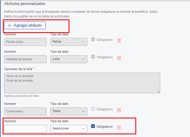 Una vez configurados todos los pasos anteriores encontrarás el apartado “Añadir Atributo” en el cual hay 3 campos bloqueados para edición que no podrán se modificados ya que son vitales para la solicitud por parte del colaborador: