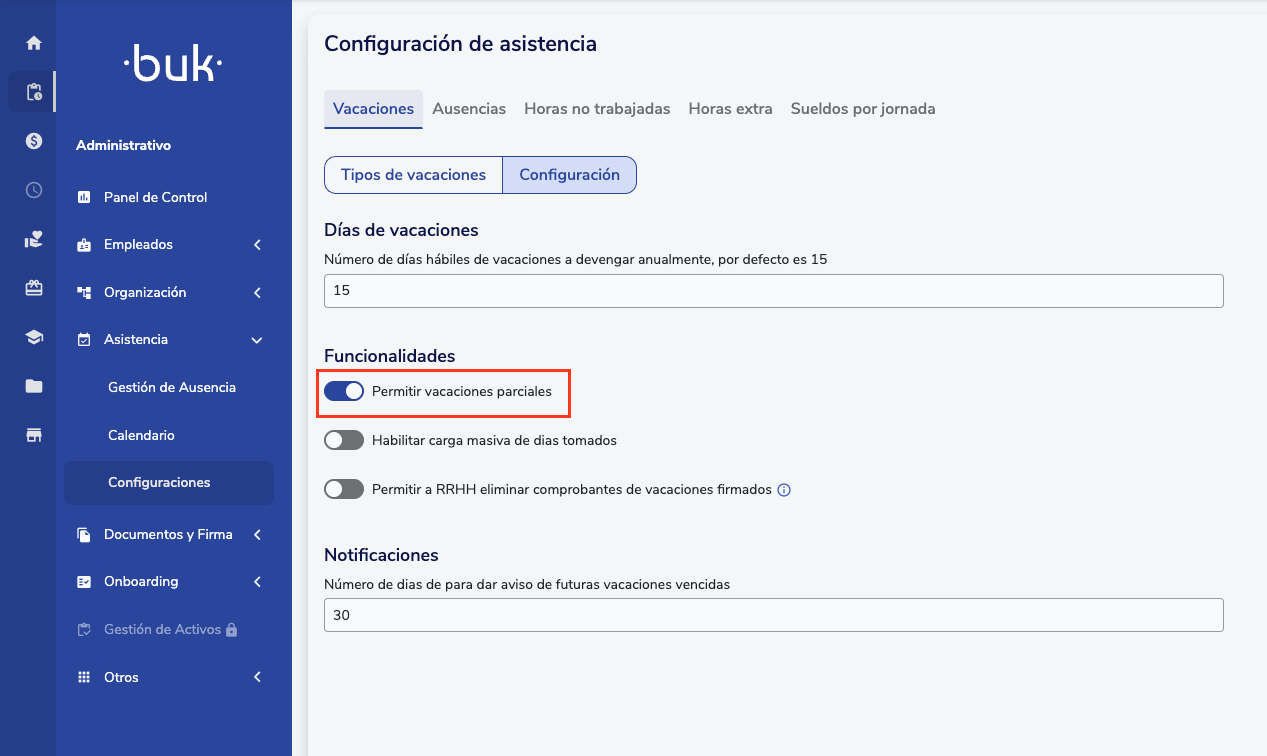 En caso de crear nuevos tipos de vacaciones o utilizar días administrativos, es muy importante que accedan a Administrativo > Asistencia > Configuración > Vacaciones > Configuración y active el checkbox “Permitir vacaciones parciales” para que posteriormente puedas asignar medios días vía Beneficios.