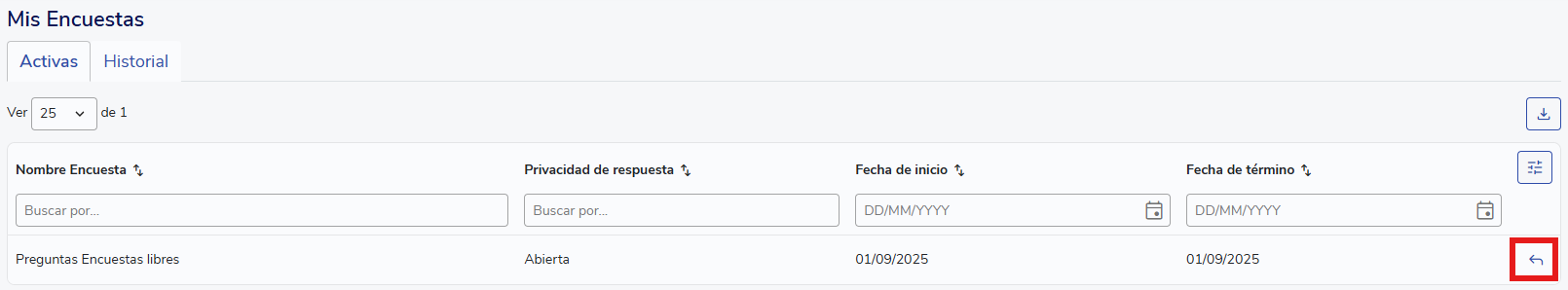 Si eres colaborador y deseas responder una encuesta, accede al símbolo de la casa llamado 'Mi Buk' y dentro de este a la parte del menú lateral que dice 'Mis Encuestas'. Allí verás las encuestas activas que tienes asignadas. Haz clic en la encuesta correspondiente para comenzar a responderla.