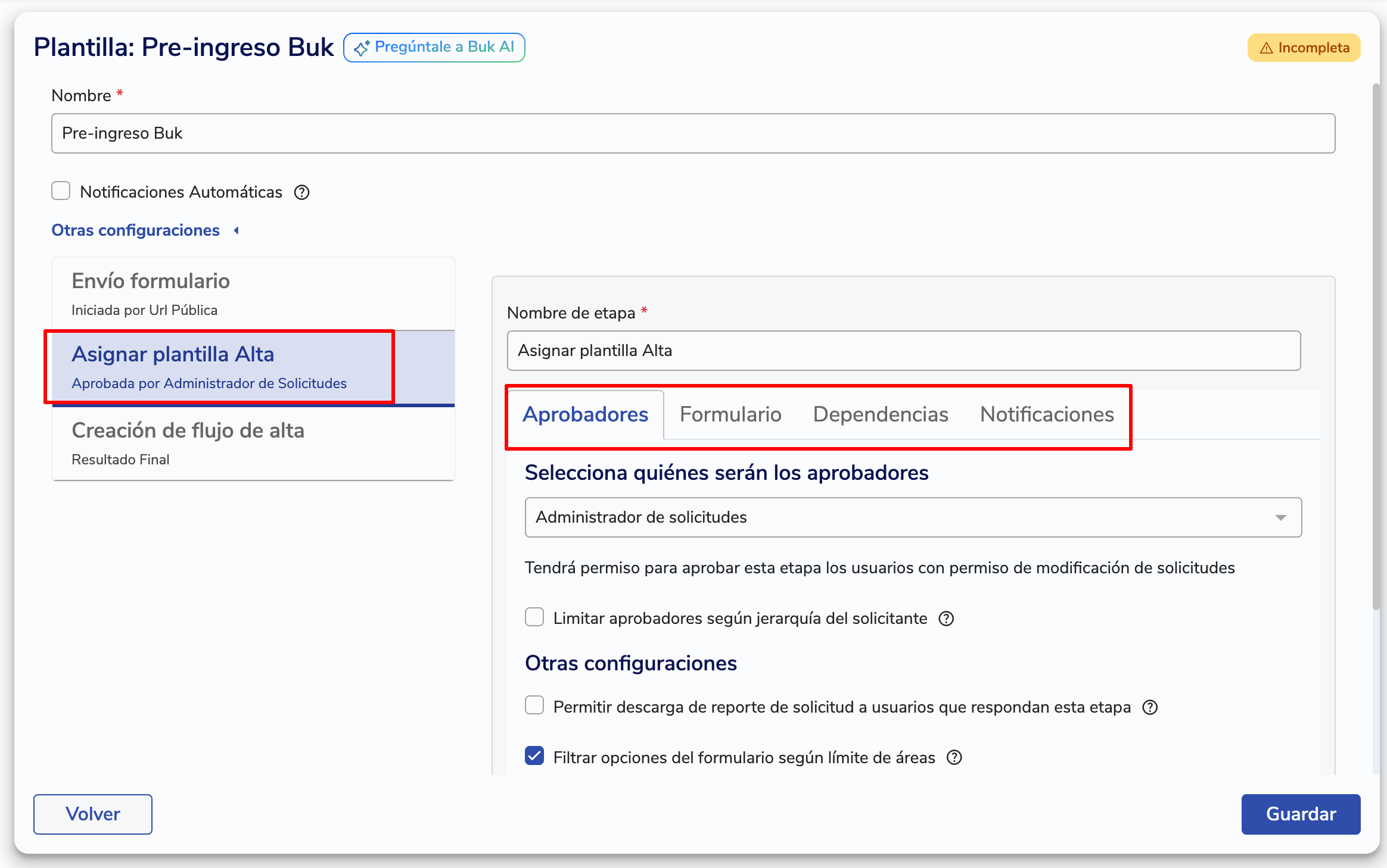 En la pestaña "Aprobadores", define quién debe aprobar la solicitud de alta.