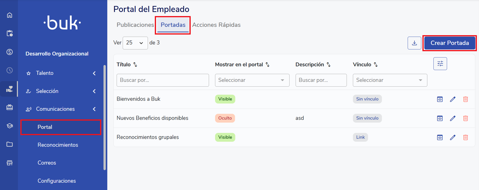 Las portadas se configuran en Desarrollo Organizacional > Comunicaciones > Portal, en la sección Portadas. Acá está el listado de todas las portadas, que están visibles u ocultas, las cuales se pueden editar o eliminar. En esta visual también se pueden crear nuevas portadas.