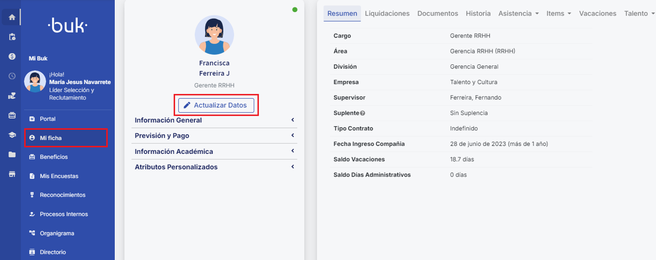 En el portal tendrás accesos directos a las principales funcionalidades de Buk, lo que facilita el acceso a las herramientas que más utilizas. Desde aquí podrás navegar fácilmente a módulos como nómina, beneficios, o cualquier otro que la empresa considere relevante.