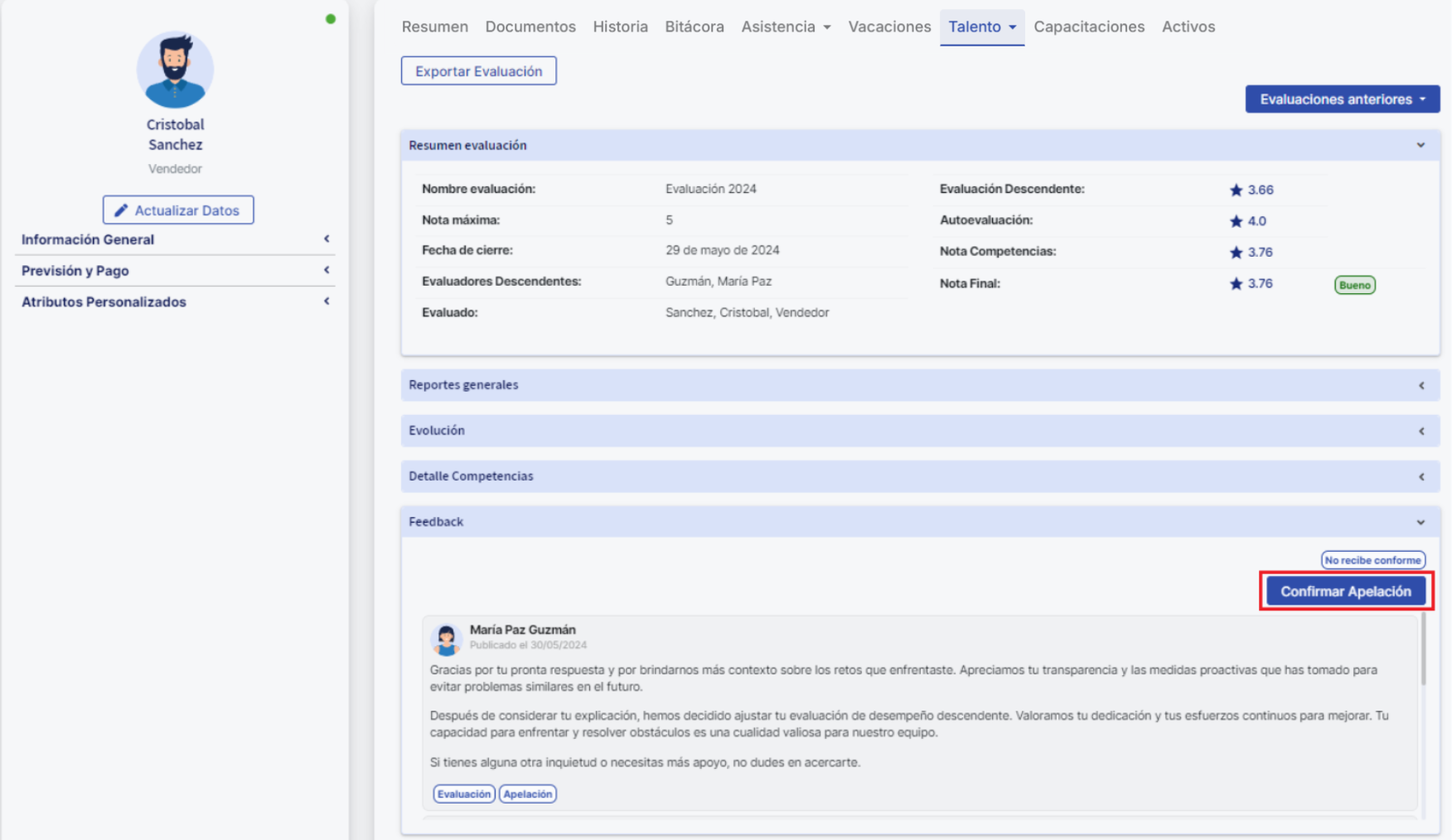 El propósito de este artículo es orientar a los colaboradores a lo largo del proceso de evaluación de desempeño, especialmente durante las fases de Feedback y Apelación. Ofrece instrucciones detalladas sobre cómo revisar el Feedback proporcionado por el supervisor en una evaluación de desempeño y cómo llevar a cabo el proceso de apelación hasta su resolución final.