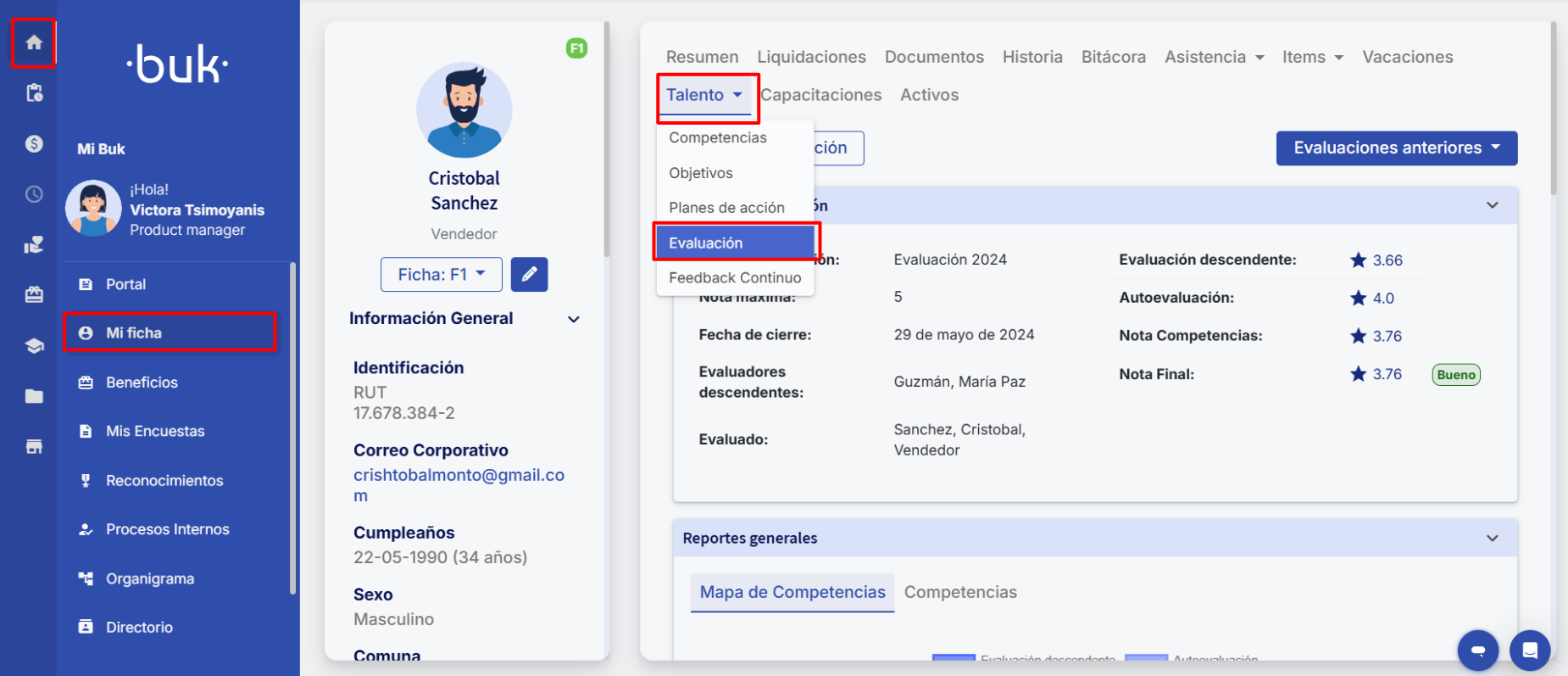 Serás dirigido a tu informe de notas. También puedes acceder iniciando sesión en tu cuenta Buk. Dirígete a "Mi ficha" y, en la pestaña "Talento", encontrarás "Evaluación".