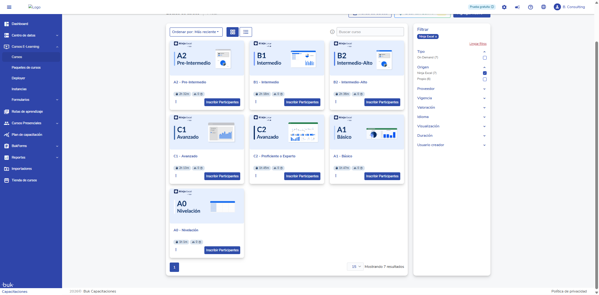 Catálogo: Al activar las instancias públicas, todos los usuarios podrán visualizar los cursos de Ninja Excel sin necesidad de una asignación previa manual.