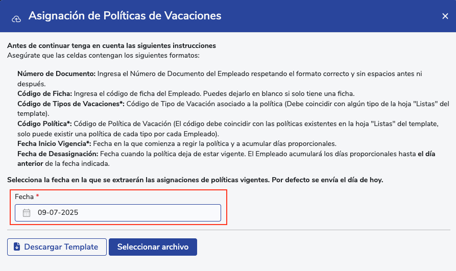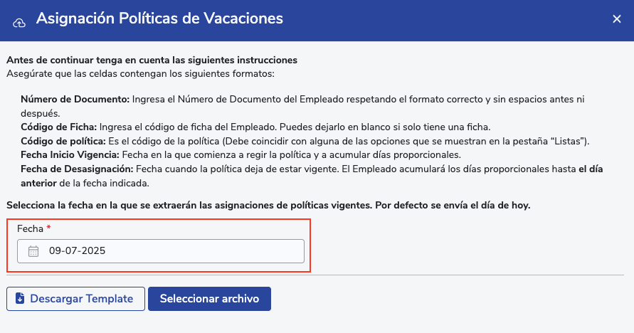 Al acceder, deberás descargar la plantilla, la cual contiene todas las asignaciones de políticas de vacaciones vigentes a la fecha seleccionada. Una vez descargada, podrás modificar los datos según sea necesario, asegurándote siempre de que las modificaciones no generen traslapes entre políticas del mismo tipo para un mismo colaborador.
