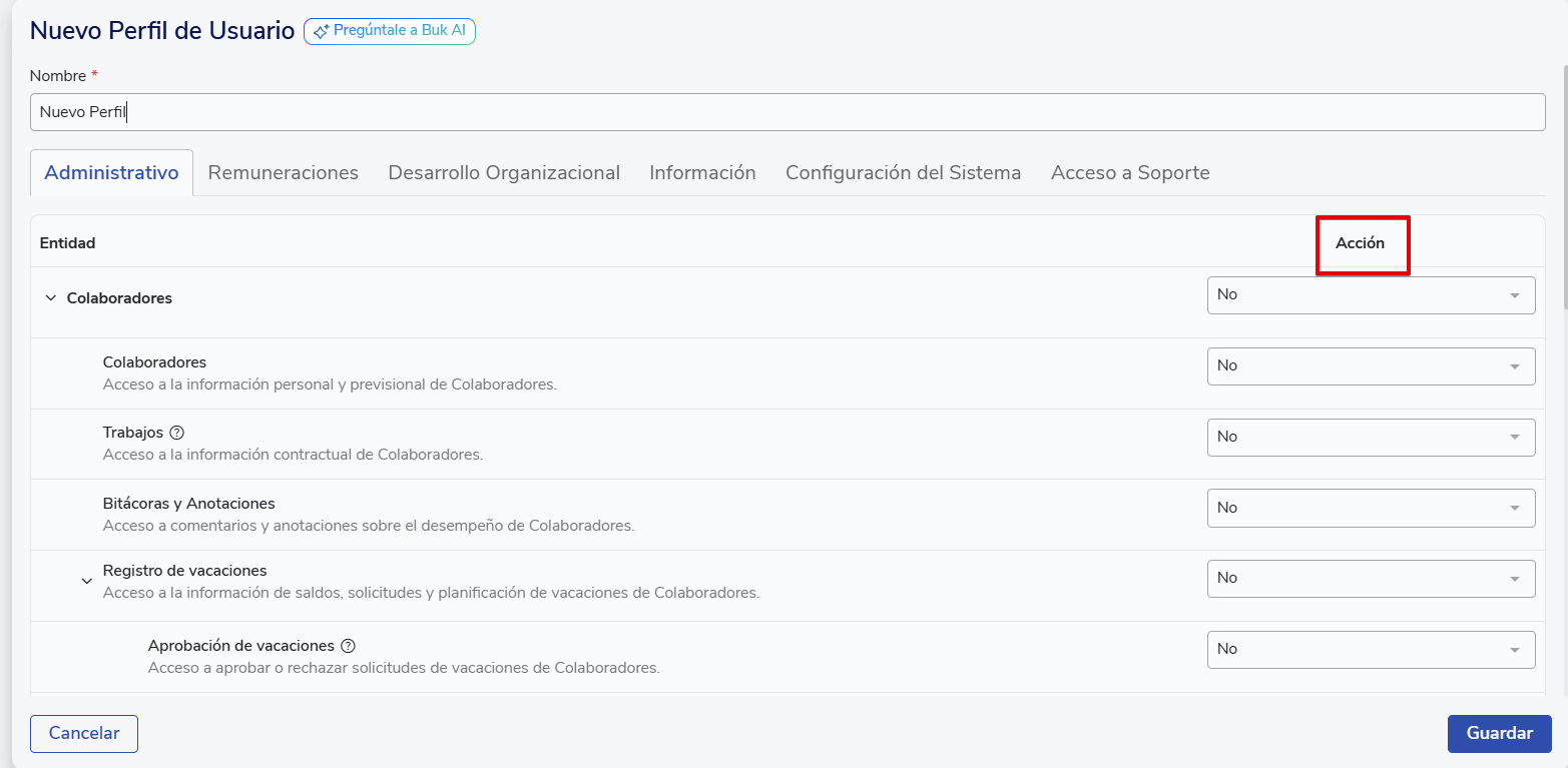 - Na coluna “Acción”, selecione a permissão que deseja conceder para cada opção