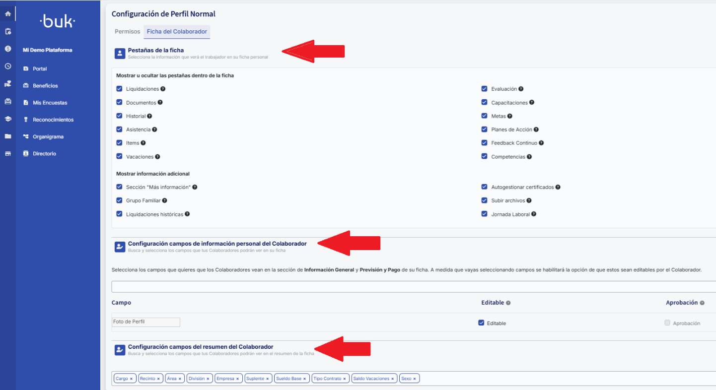 Nesta seção você poderá selecionar quais abas estarão disponíveis para o colaborador dentro da sua ficha, como "Datos personales", "Vacaciones", "Documentos", entre outras. Isso permite adaptar a ficha às necessidades de cada empresa e ocultar o que não for relevante.