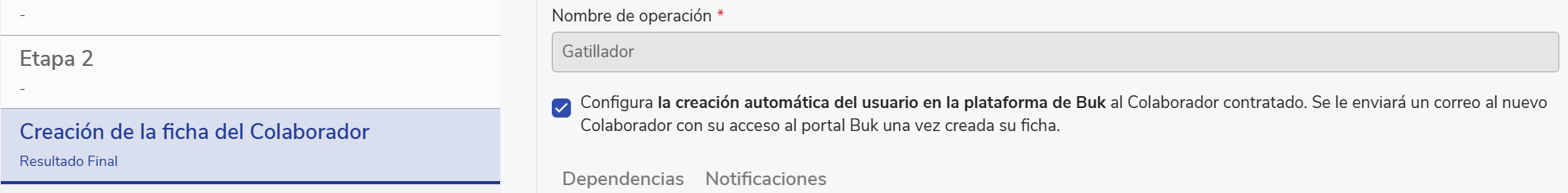 "Configura a criação automática do usuário na plataforma Buk para o Colaborador contratado. Será enviado um email ao novo Colaborador com seu acesso ao portal Buk assim que sua ficha for criada."