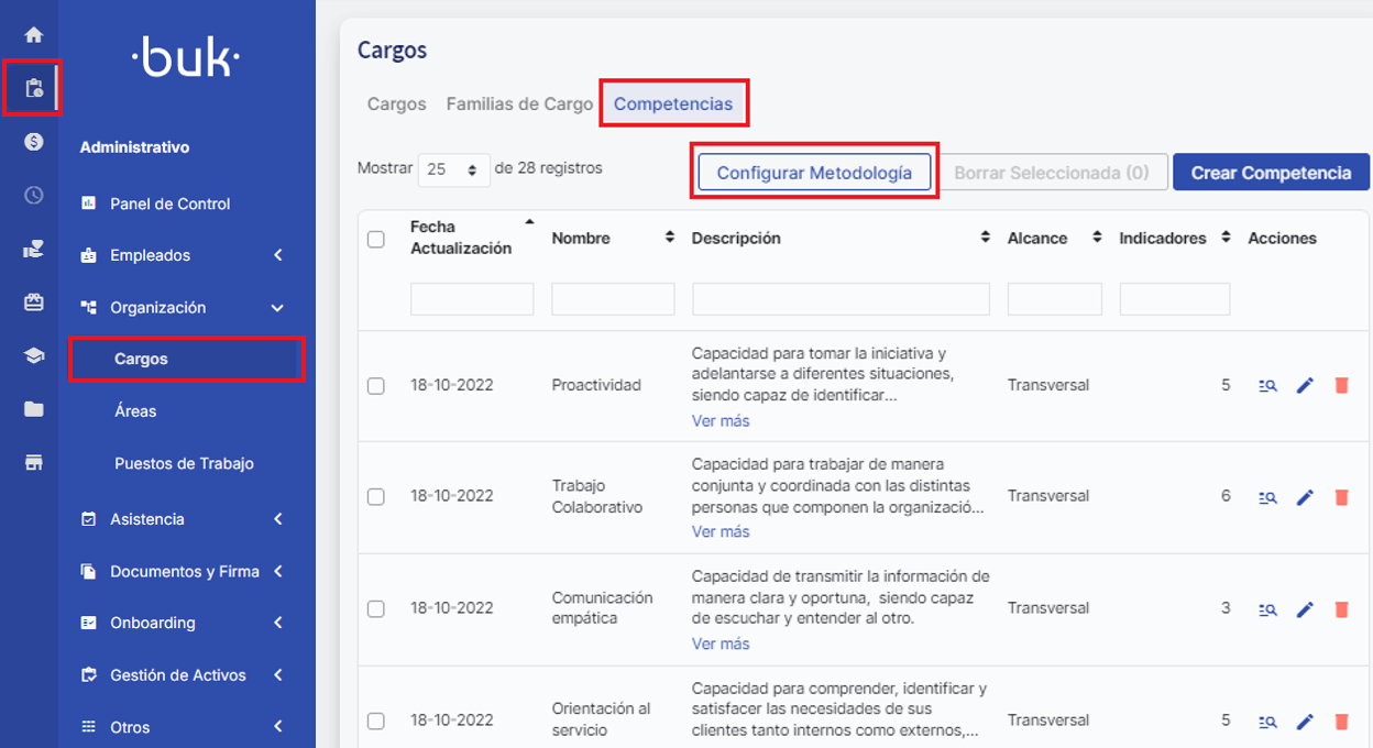 Para criar competências na metodologia Indicadores comportamentais, acesse o menu lateral e selecione "Administrativo". Depois, escolha "Organização" e clique em "Cargos". Em seguida, selecione a aba "Competências", onde você encontrará uma lista de 22 competências organizadas por: data de atualização, nome, descrição, escopo, indicadores e ações. Essas competências estão predefinidas na plataforma e você pode excluí-las ou editá-las clicando nos ícones correspondentes de lápis ou lixeira, respectivamente.