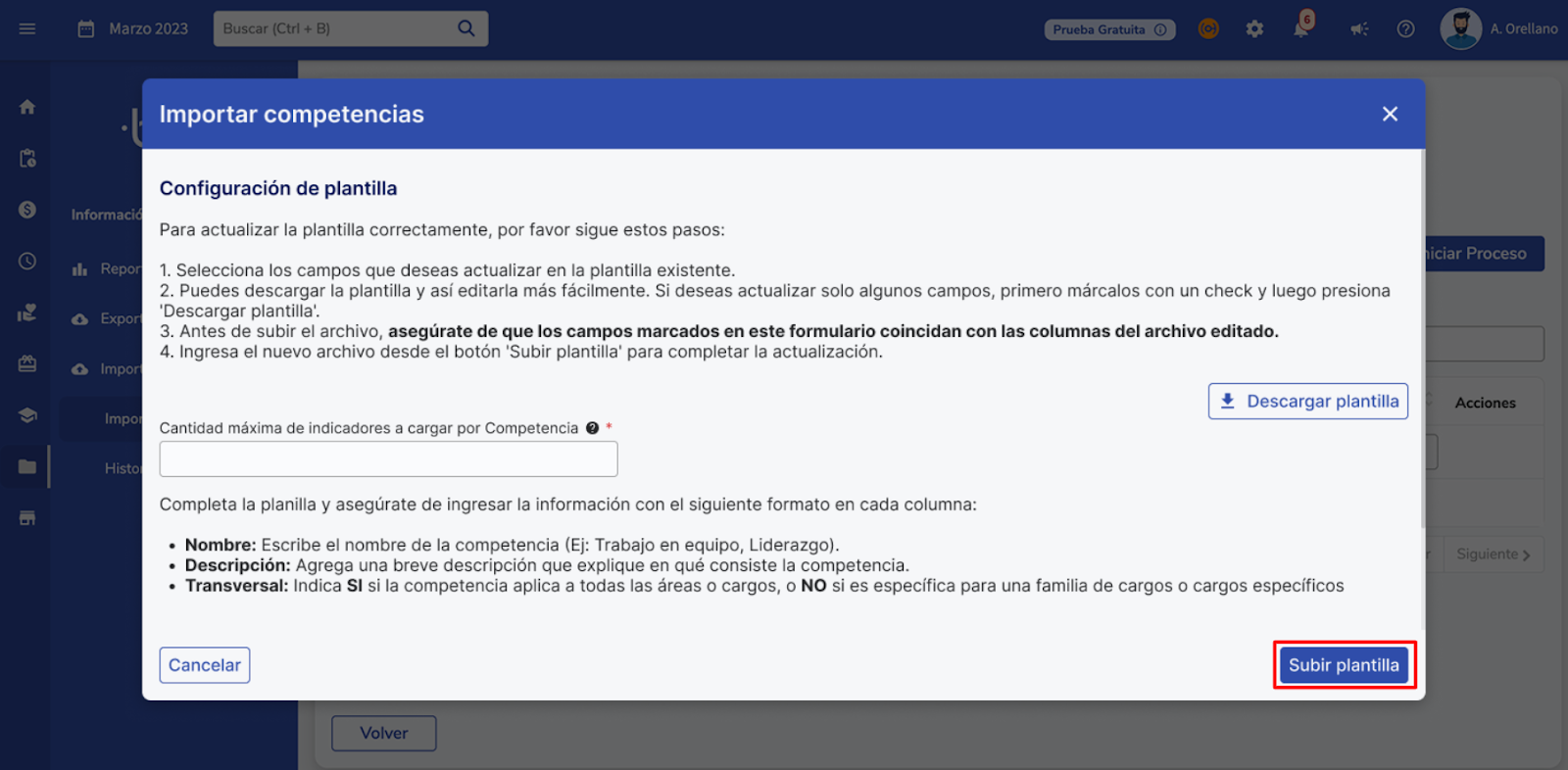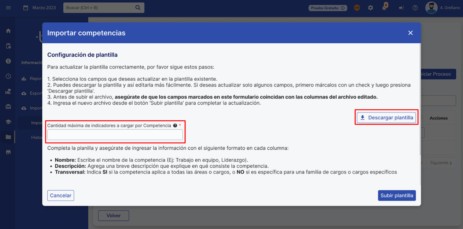 Antes de baixar o modelo, lembre-se de inserir aquantidade máxima de indicadores que cada competência terá. Isso é importante, pois serão adicionadas ao arquivo tantas colunas de indicadores quanto o número que você indicar nesta etapa.