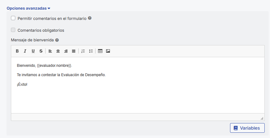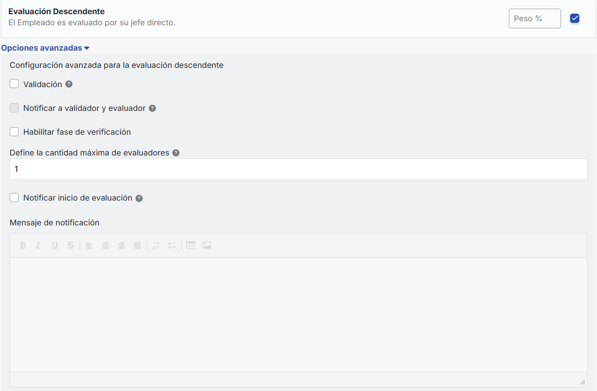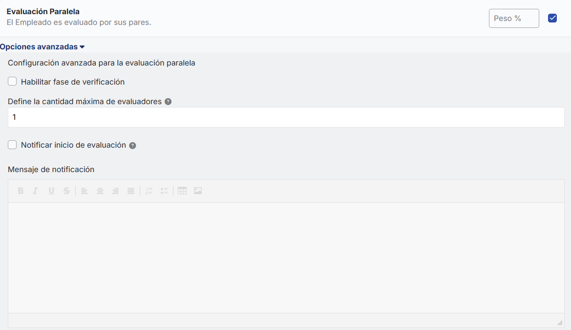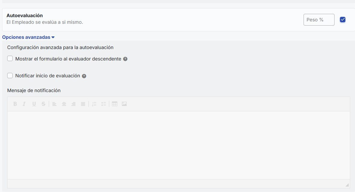 - Mensagem de notificação:É habilitada se a opção de notificar início da avaliação estiver ativada. Aqui você pode escrever a mensagem que será enviada aos avaliadores quando a avaliação começar.