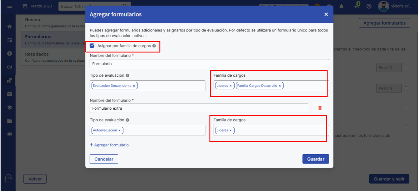 Caso selecione “Atribuir por família de cargos”, será possível atribuir uma ou mais família(s) de cargos a cada formulário.