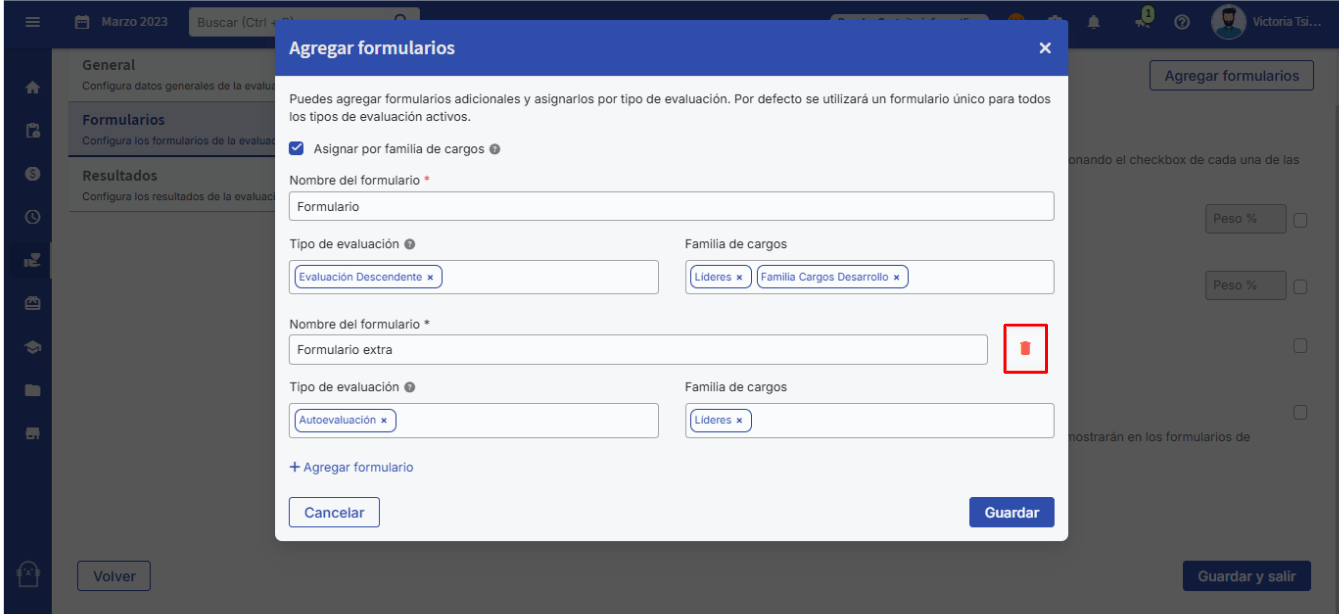 Se quiser excluir um formulário que adicionou, basta selecionar o ícone de lixeira em vermelho. Lembre-se que o primeiro formulário não poderá ser excluído, pois é o que vem obrigatoriamente por padrão.