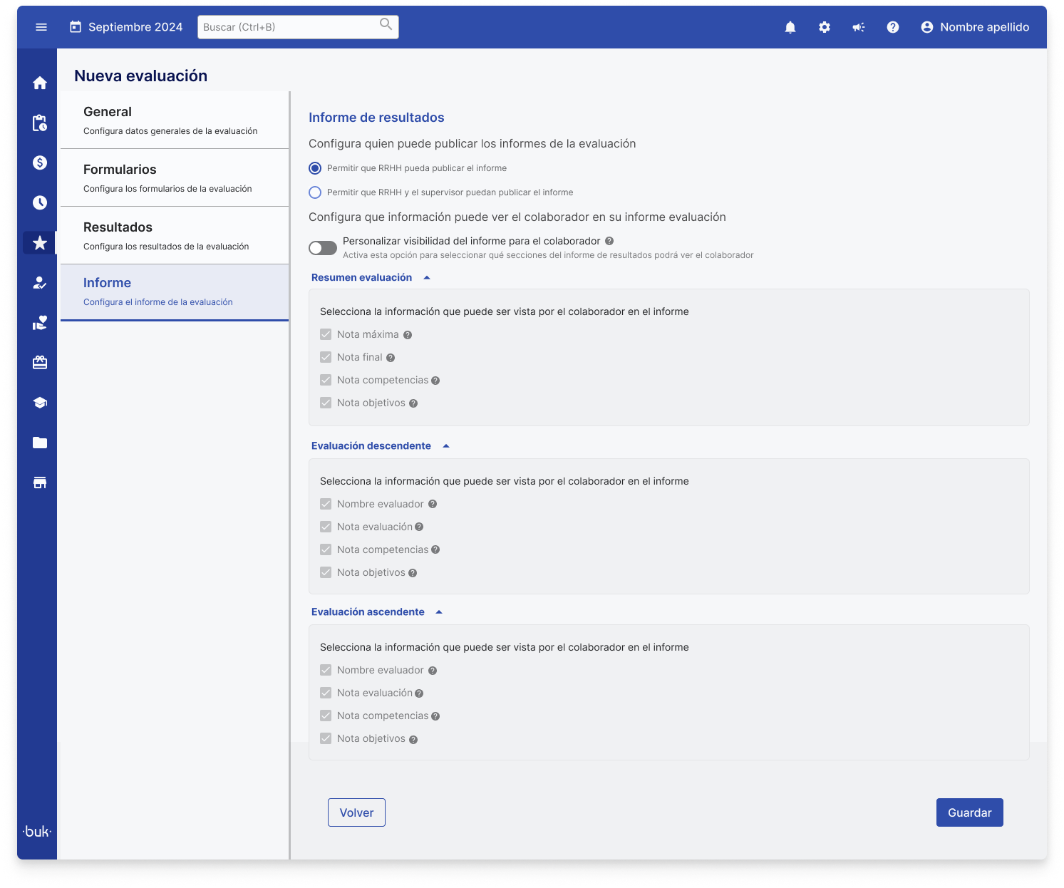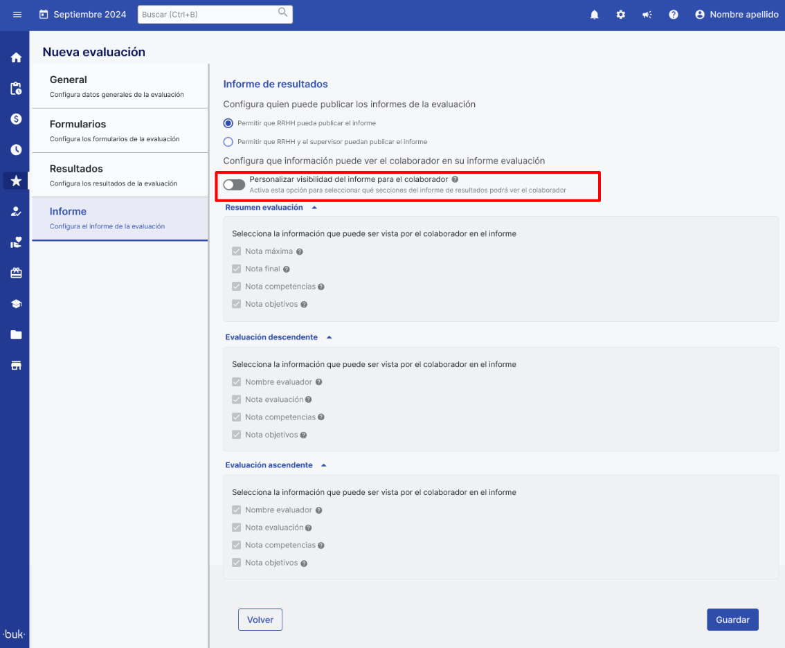 Ao ativar a opção de“Personalizar visibilidade do relatório para o colaborador”, será possível selecionar quais seções do relatório de resultados o colaborador poderá visualizar.