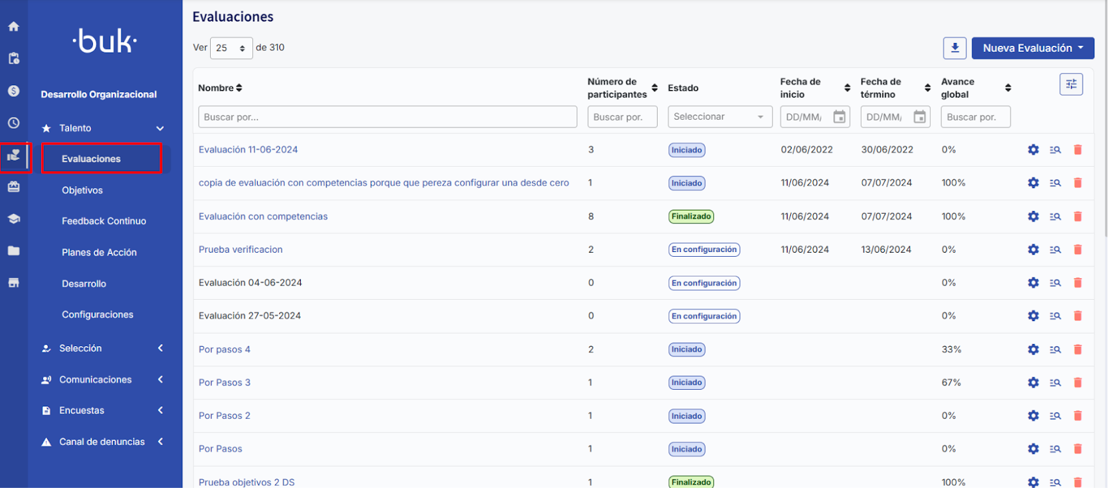 Para começar a configuração de uma avaliação de desempenho, é importante que você já tenha criado e configurado as competências, e depois carregado as metas ou objetivos correspondentes. Uma vez concluídas essas etapas, acesse a seção“Desenvolvimento Organizacional” > “Talento”, e clique em“Avaliações”. Nesta visualização serão exibidas todas as avaliações de desempenho previamente criadas, estejam elas no estado“Em configuração”,“Iniciada”ou“Finalizada”.