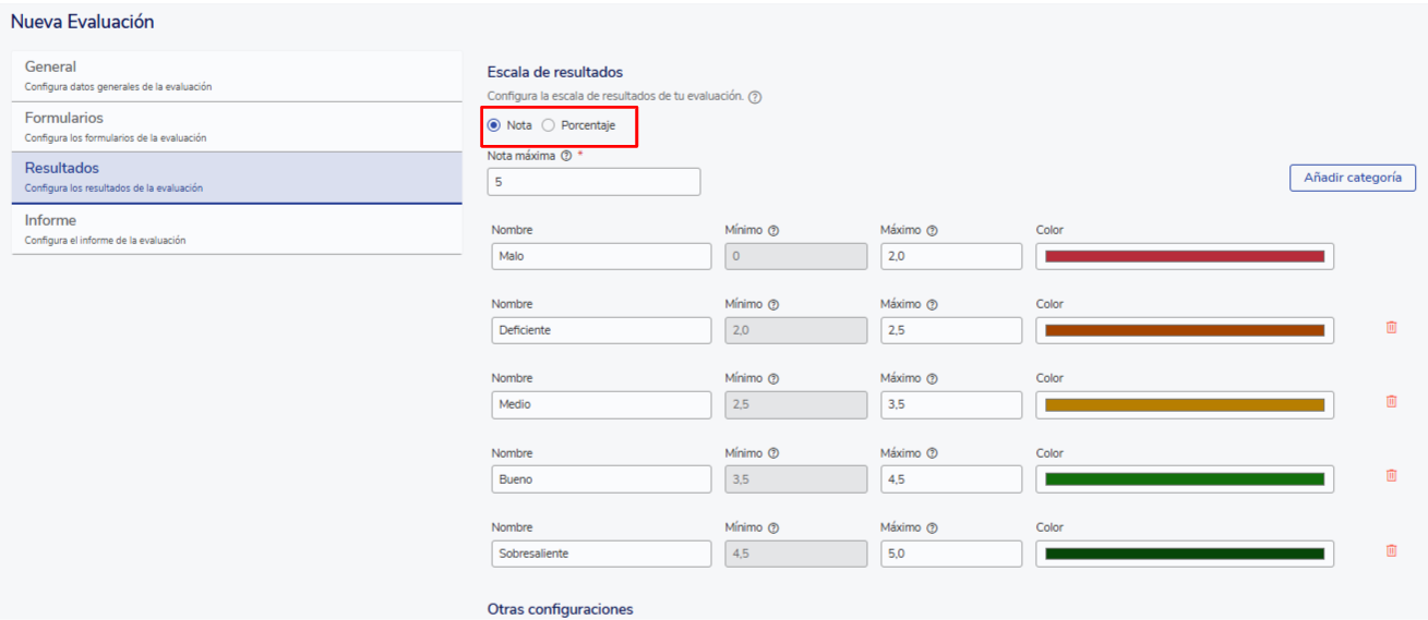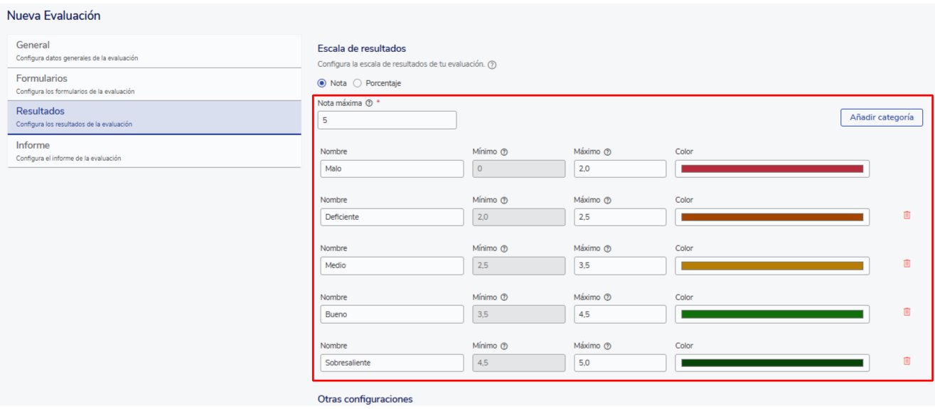 Você deve definir a nota máxima da sua escala de resultados e estabelecer as categorias de notas, definindo seus nomes, faixas e cores. Nos relatórios, você poderá revisar automaticamente em qual categoria está cada colaborador com sua respectiva etiqueta.