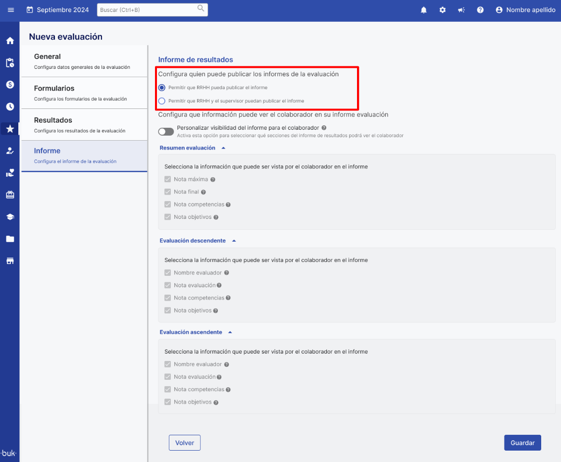 Nesta etapa você poderá configurar diferentes aspectos do relatório da Avaliação de Desempenho que será publicado.