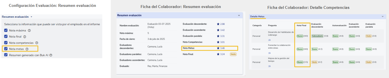 - Ao desmarcar a caixaNota objetivos/metas, esse campo será ocultado na seçãoResumo da avaliaçãoe também será ocultada a coluna Nota Final dentro da seçãoDetalhe de objetivos/metas.