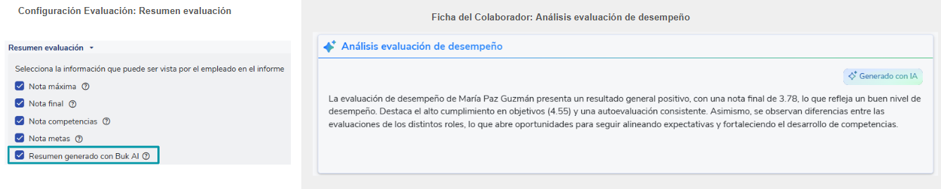 - Ao desmarcar a caixaResumo da avaliação com Buk AI, será ocultada a seção deAnálise da avaliação de desempenhoque consiste em um resumo da avaliação gerado por inteligência artificial.