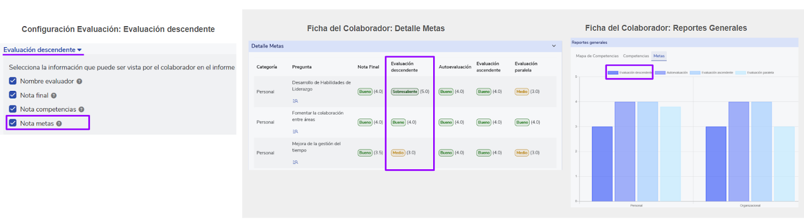 - Ao desmarcar a caixaNota objetivos/metas, a coluna correspondente a esse tipo de avaliação será ocultada na seçãoDetalhe Objetivos/Metas, e também será ocultada a informação dessa avaliação na seçãoRelatórios gerais.
