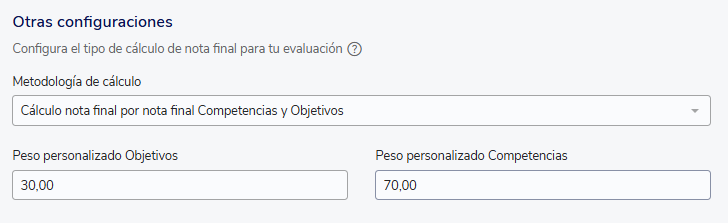 Quando você configura uma avaliação de desempenho e adiciona competências e objetivos, na aba"Resultados"você poderá selecionar ametodologia "Cálculo nota final por nota final competencias y objetivos"que determinará como será calculada a nota final do colaborador.