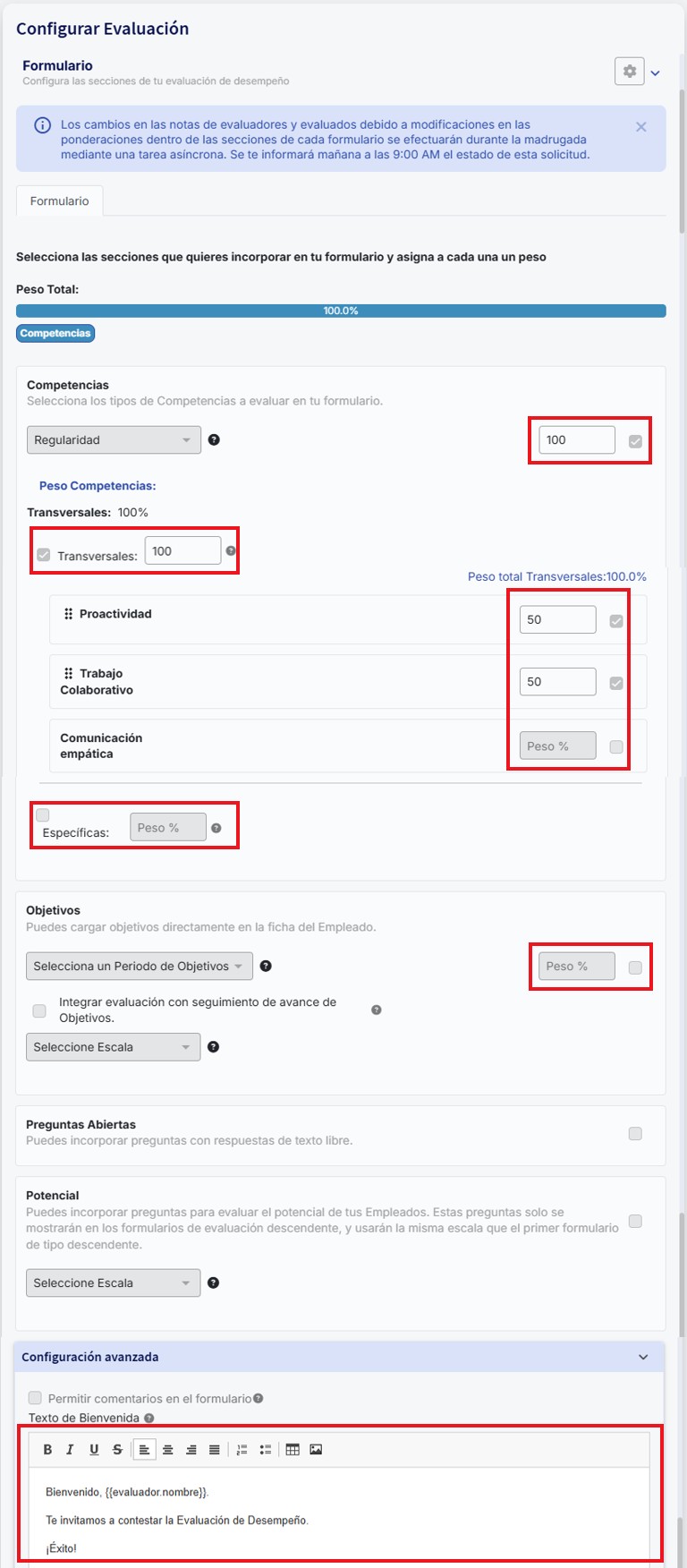 É importante destacar que só é possível modificar pesos e ponderações, mas não se podem adicionar nem eliminar competências ou objetivos. Se um objetivo não foi incluído inicialmente, não poderá ser adicionado posteriormente nem ter seu peso modificado. Por fim, é possível editar o texto de boas-vindas do formulário.