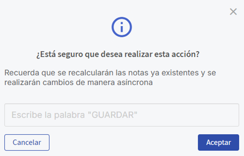 Algumas alterações serão refletidas imediatamente, enquanto outras exigem processamento adicional. As modificações em textos, datas e na quantidade máxima de avaliadores são aplicadas de forma imediata. Em contrapartida, os ajustes nos pesos por etapas, os pesos nas seções, as ponderações e a escala de resultados são processados durante a madrugada e estarão visíveis a partir do dia seguinte às 9:00, horário do Chile.