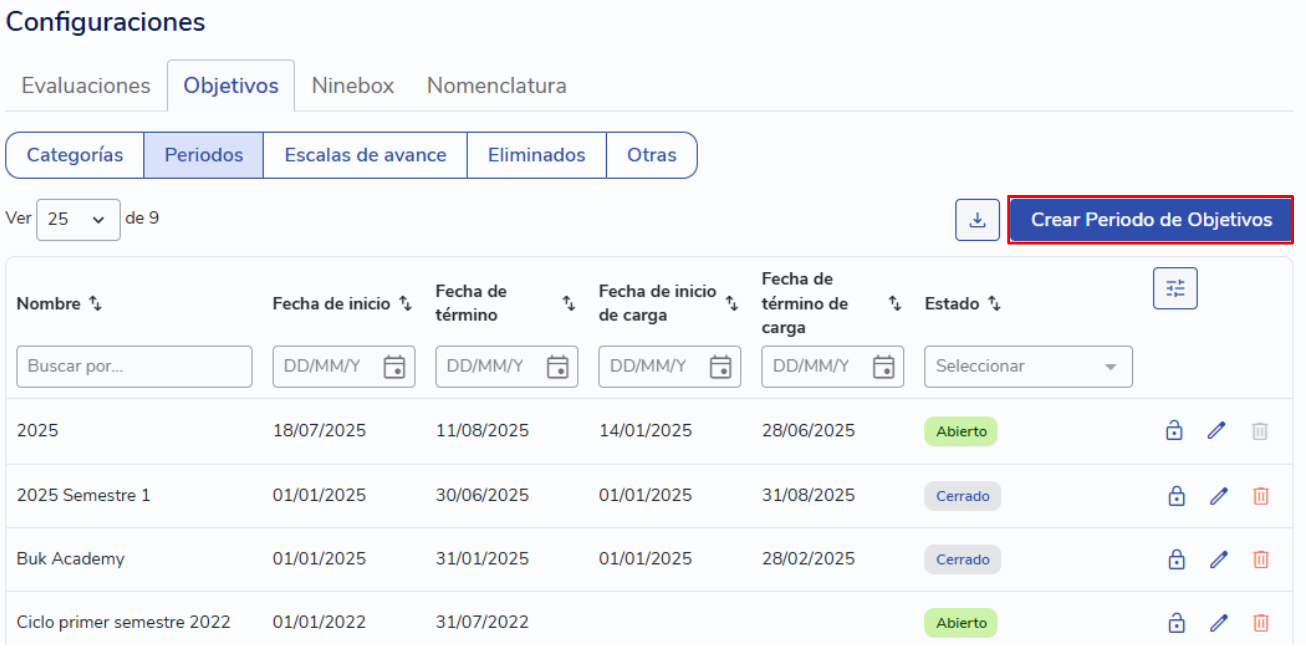 Para criar um período, clique em "Crear periodo de Objetivos".