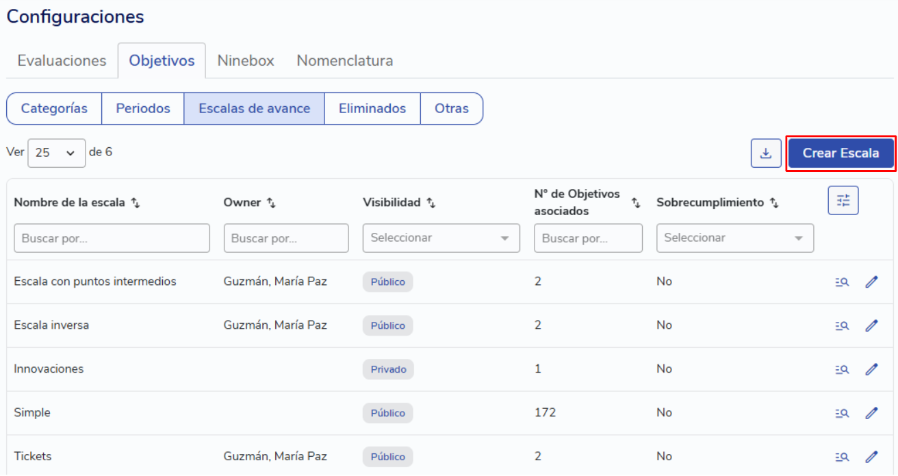 Todas as escalas podem ser editadas e também podem ser criadas novas clicando em "Crear Escala". Aqui é necessário estabelecer um nome para a escala, a visibilidade, o nome da unidade de medida, o estado inicial e o resultado esperado.