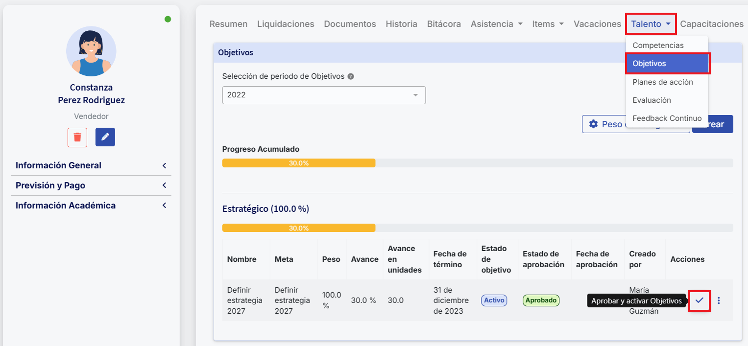 No módulo de Gestión del Desempeño, você tem a opção de registrar os objetivos/metas dos colaboradores. Tanto líderes quanto colaboradores poderão acompanhar estes diretamente a partir da ficha de cada colaborador. Além disso, você tem a possibilidade de incorporar esses objetivos e medi-los em avaliações de desempeño.