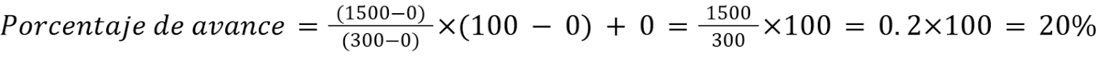 Por exemplo, para calcular o percentual de avanço de1700 unidades, esse valor se encontra nosegundo intervalo. Portanto, o cálculo considera que 100% corresponde a 1500 unidades (valor inicial do intervalo) e 120% a 2000 unidades (valor final do intervalo). A fórmula para calcular o percentual de avanço neste segundo intervalo é: