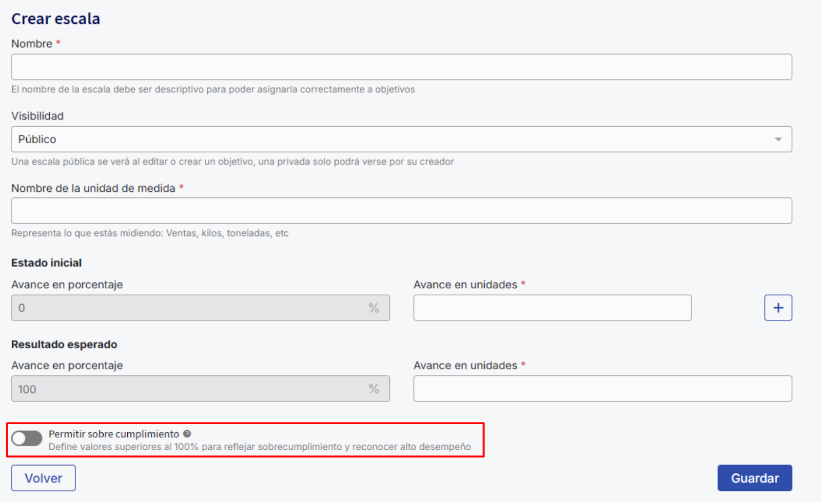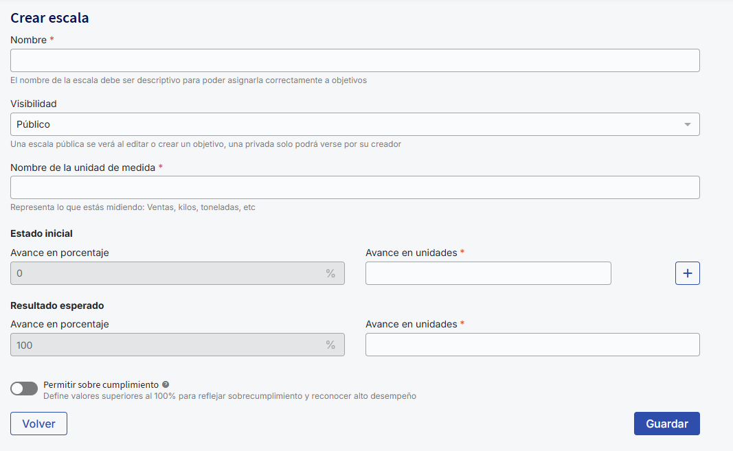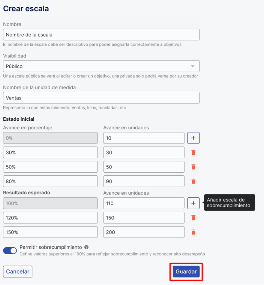 Uma escala com supercumprimento é aquela que permite registrar, medir e refletir um avanço no cumprimento de um objetivo que supera 100% do valor meta. Essa funcionalidade reconhece e quantifica o desempenho que excede a meta por meio de escalas que incluem pontos de progresso superiores a 100%, facilitando assim uma avaliação mais precisa e motivadora do desempenho.