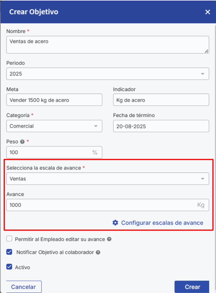 Insira as informações relacionadas ao objetivo e selecione a escala de avanço. Após selecioná-la, você verá que será indicada a unidade de medida real. Você pode clicar em "Configurar escalas de avanço" para ser direcionado automaticamente a esta seção.