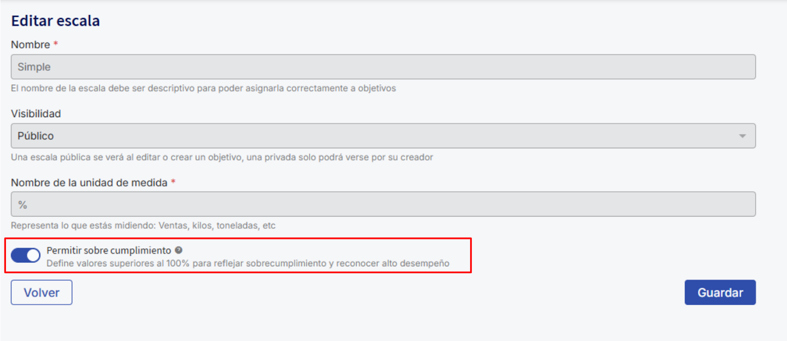Ao ativar o switch de supercumprimento, será habilitada a opção de adicionar valores para escalas superiores a 100%.