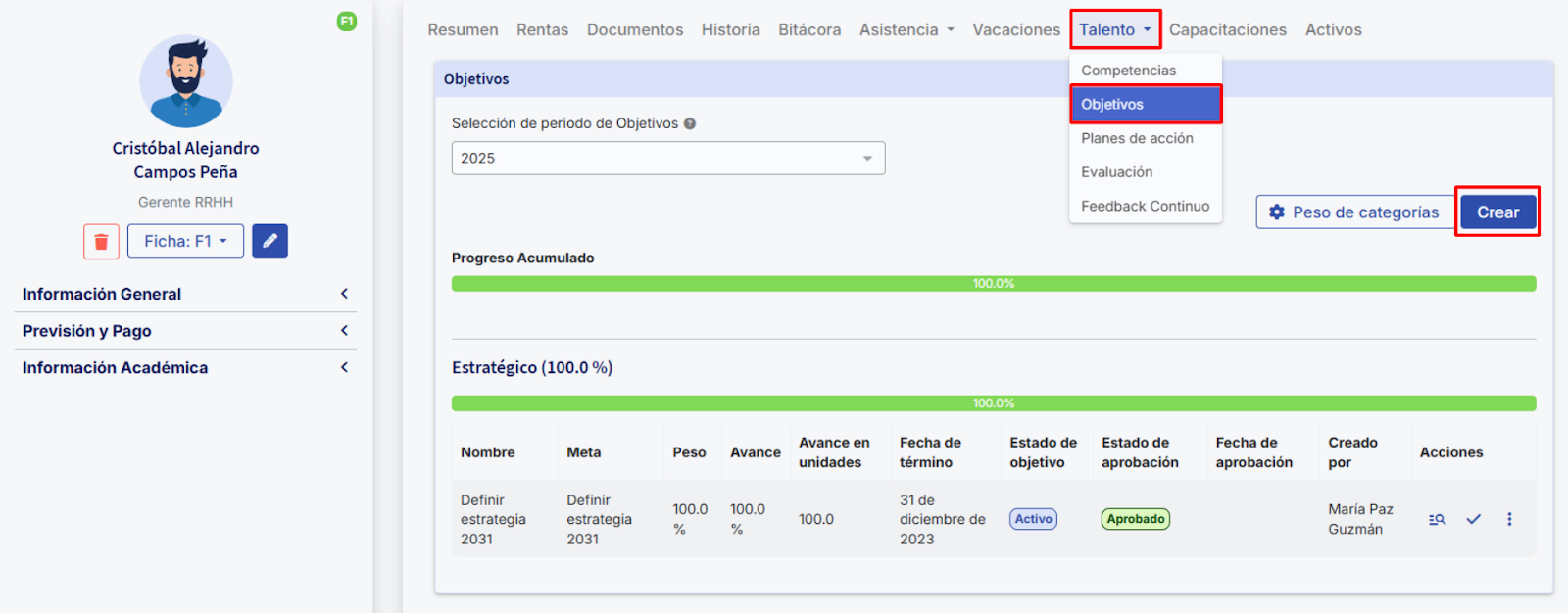 Você pode atribuir objetivos aos colaboradores manualmente acessando o perfil deles. Na seção "Talento", vá em "Objetivos" e selecione a opção "Criar".