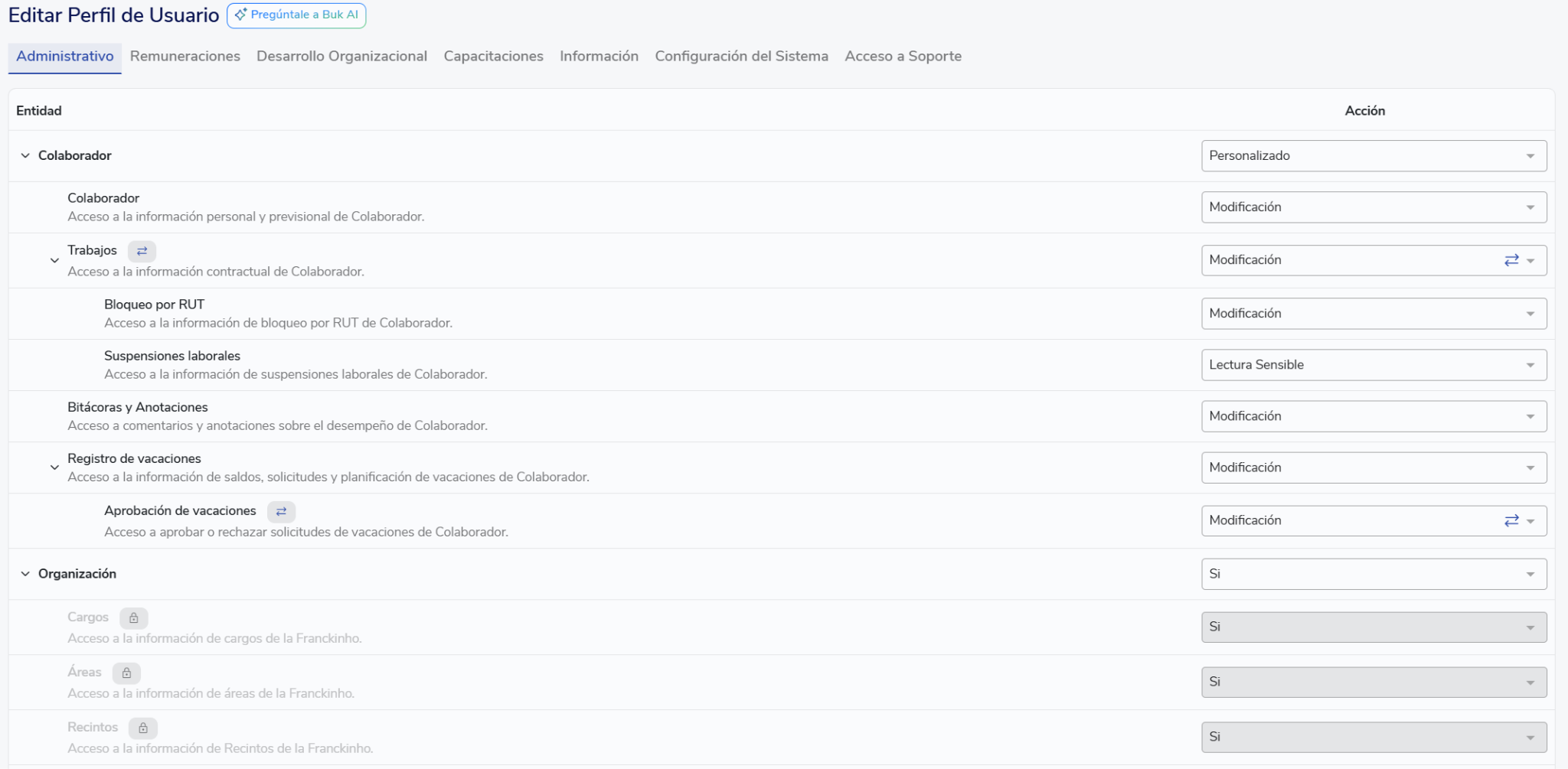 Buk atualizou a atribuição de permisos conforme o plano comercial contratado. Embora a estrutura de Pestañas, Entidades y Permisos se mantenha, a capacidade de editá-los agora varia conforme o plano.