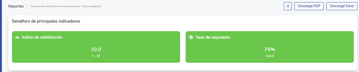 Este artigo tem como propósito orientar os usuários com o papeladministradoresuper administradoren el acceso, visualización y descarga del reporte de satisfacción vinculado a cursos presenciales. Su alcance incluye la navegación por las secciones del reporte, interpretación de indicadores clave y exportación de los datos en distintos formatos (Excel y PDF). Ten en cuenta que el acceso a este reporte está habilitado únicamente para los roles mencionados anteriormente.