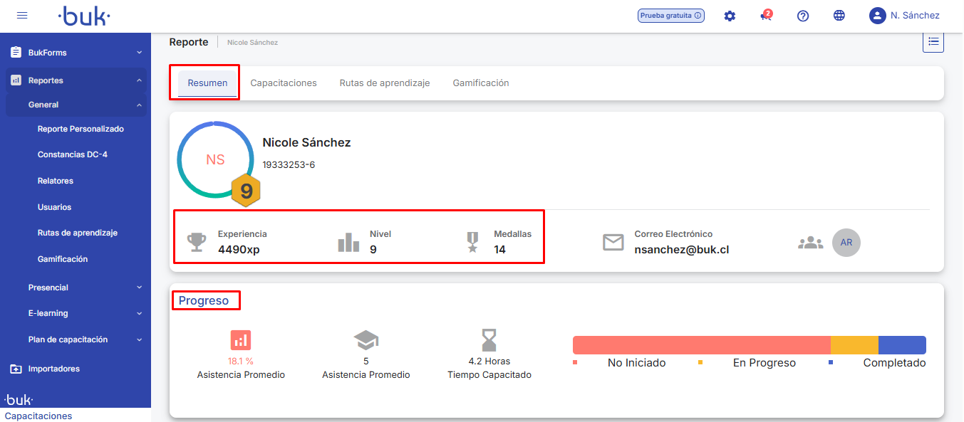 🔹Resumo:Exibe informações resumidas do colaborador sobre pontos de experiência, níveis, medalhas e progresso obtido até a data.