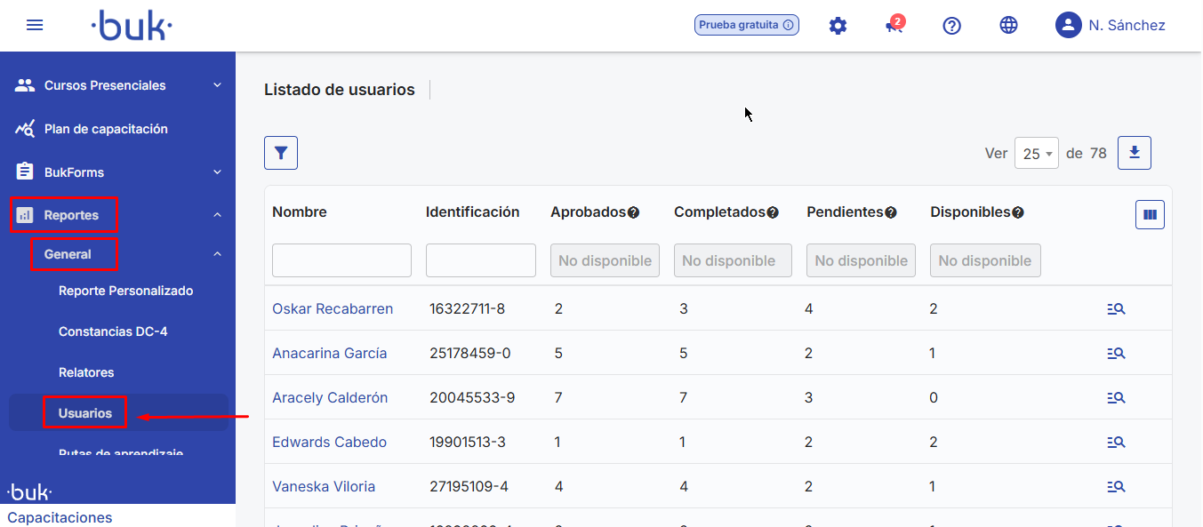 Aqui é fornecida uma lista de todos os usuários registrados na plataforma, em formato de tabela. Esta tabela inclui: