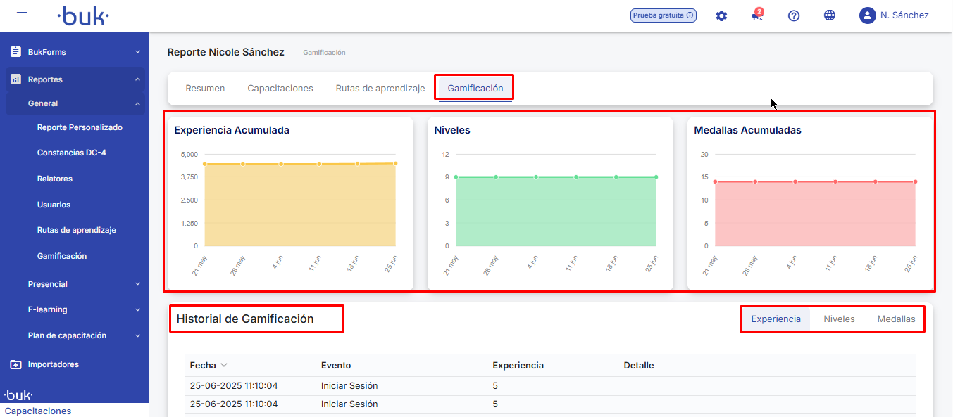 🔹Gamificação:Esta seção inclui gráficos com o progresso do usuário em pontos de experiência ganhos, nível alcançado, medalhas obtidas e um histórico detalhado com as seguintes informações: