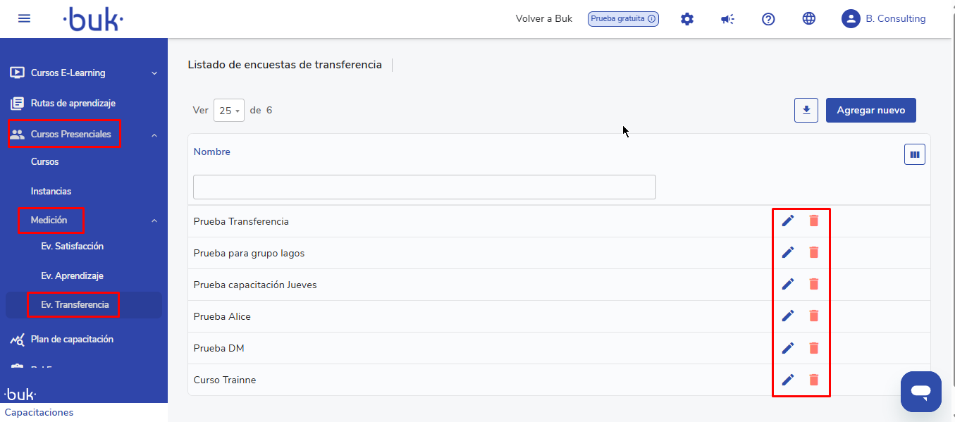 - Desde o menu lateral esquerdo, vá paraCursos Presenciais, selecioneMediçãoe clique emEv. Transferência.